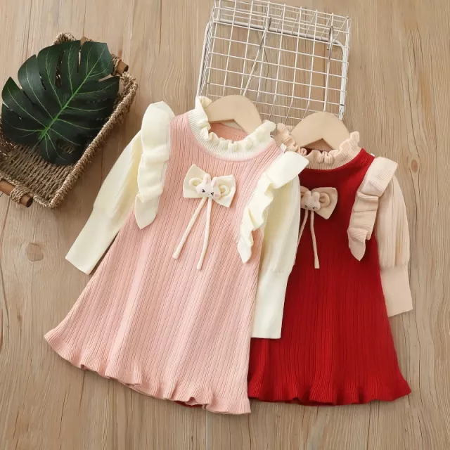 Autumn Girls Knit Dress with Bow & Ruffles – Soft Long Sleeve Jumper