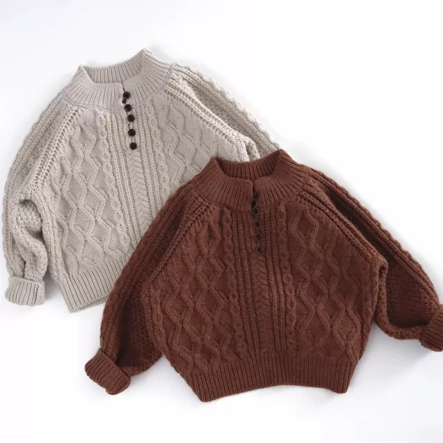 Crafted from breathable, high-quality cotton, it keeps your child toasty without overheating. The cable knit texture adds a charming, retro-inspired touch, while the stretchy fit ensures easy movement during active play. The mock neck with button detail not only adds style but also offers extra warmth and easy wearability. Plus, the slightly oversized chest design makes it perfect for layering over t-shirts or under jackets.